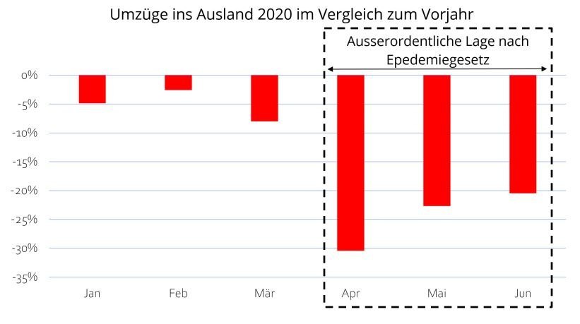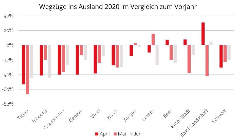 Überdies erschwerte die Einschränkung der Personenfreizügigkeit die Umzüge über die Landesgrenze hinweg. Die Umzüge ins Ausland lagen im April bzw. Juni zum Vorjahr 30% bzw. 20% tiefer. Der Effekt der Pandemie hielt also weitaus länger an als bei den Inlandsumzügen. Kantone mit Landesgrenzen zu Italien und Frankreich zeigten stärkere Rückgänge im Vergleich mit diesen zu Deutschland oder Österreich.
