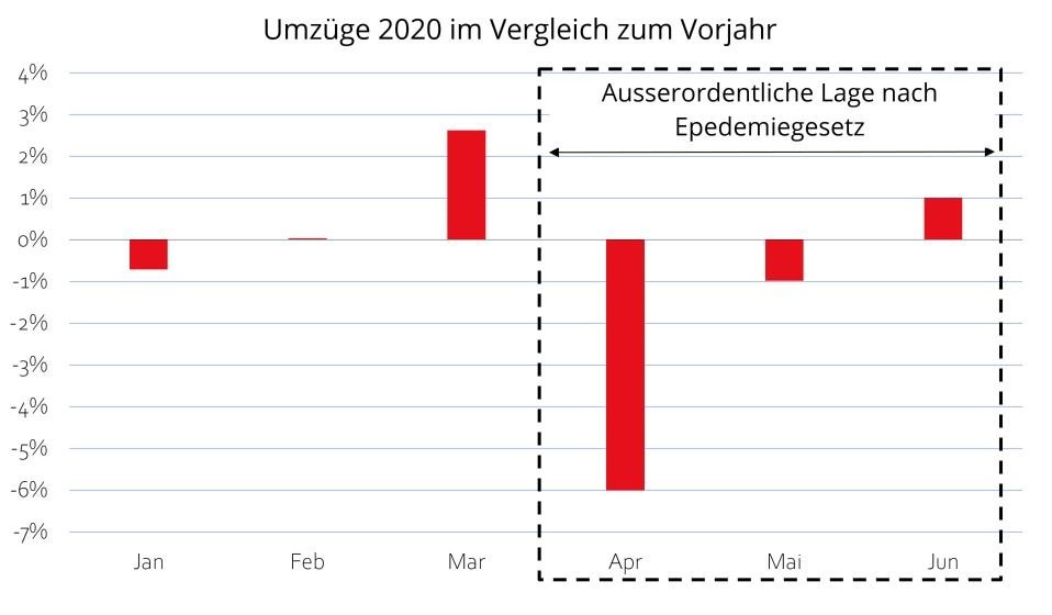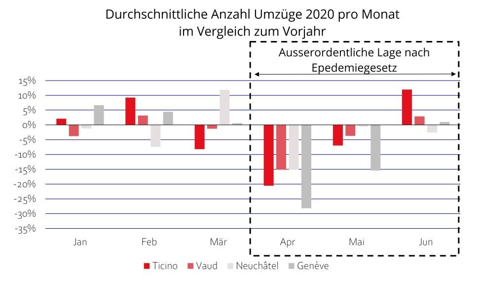 Der Bundesrat folgte aber letztlich den Empfehlungen der Interessensgruppen und erliess am 27. März per Verordnung, dass Aus- und Einzug unter der Einhaltung der Empfehlungen betreffend Hygiene und sozialer Distanz des Bundesamtes für Gesundheit zulässig bleiben. Dies kam all denjenigen entgegen, die auf den ordentlichen Kündigungstermin bereits Ihren Umzug geplant hatten. Diese Umzüge blieben damit im April und Mai möglich. Der Rückgang hielt sich folglich schweizweit in Grenzen, manifestierte sich aber im stärker durch Infektionen betroffenen Tessin und in der an Frankreich grenzenden Westschweiz am stärksten. Vor der Pandemie zeigt sich hingegen lange ein stabiles Bild bei den Umzügen.