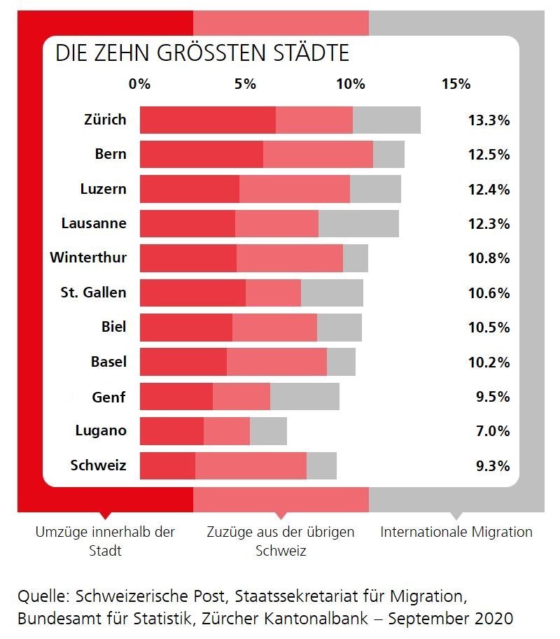 Die höchsten Quoten von über 10% werden unverändert in den Städten- und Stadtkantonen gemessen, allem voran in Zürich und Lausanne mit 13.3 bzw. 12.3% im Jahr 2019. Grund für die höheren Umzugsquoten in den Grossstädten ist nicht nur der liquidere Arbeits- und Mietwohnungsmarkt, sondern auch der deutlich höhere Einwanderungsanteil. In Zürich macht dieser ein Viertel aus, in Genf und Lausanne sogar je rund ein Drittel.