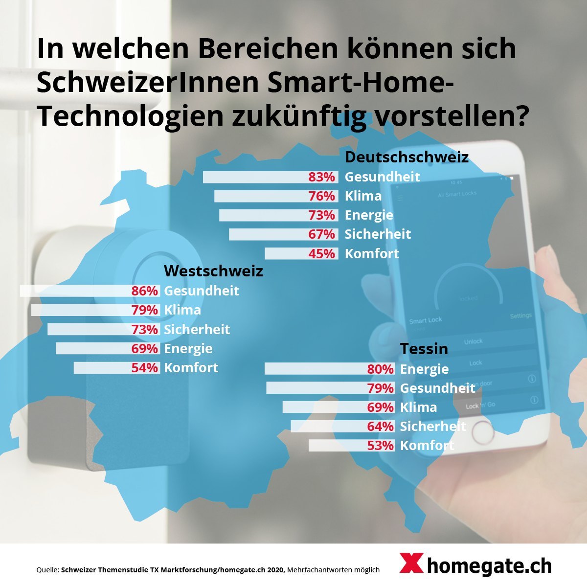 10. November 2020 - 62% der Schweizerinnen und Schweizer interessieren sich für die Entwicklung von Smart-Home-Technologien. Deutschschweizer und Westschweizer können sich insbesondere die Nutzung neuer Systeme im Gesundheitsbereich gut vorstellen. Die Tessiner hingegen interessieren sich eher für smarte Geräte im Bereich Energie. Trotz Interesse hält sich die Nutzung von Smart-Home-Lösungen jedoch noch in Grenzen. Erst rund ein Sechstel nutzt beispielsweise Systeme oder Geräte im Bereich Energie. Dies zeigt eine aktuelle Umfrage von homegate.ch zum Thema Wohnen.